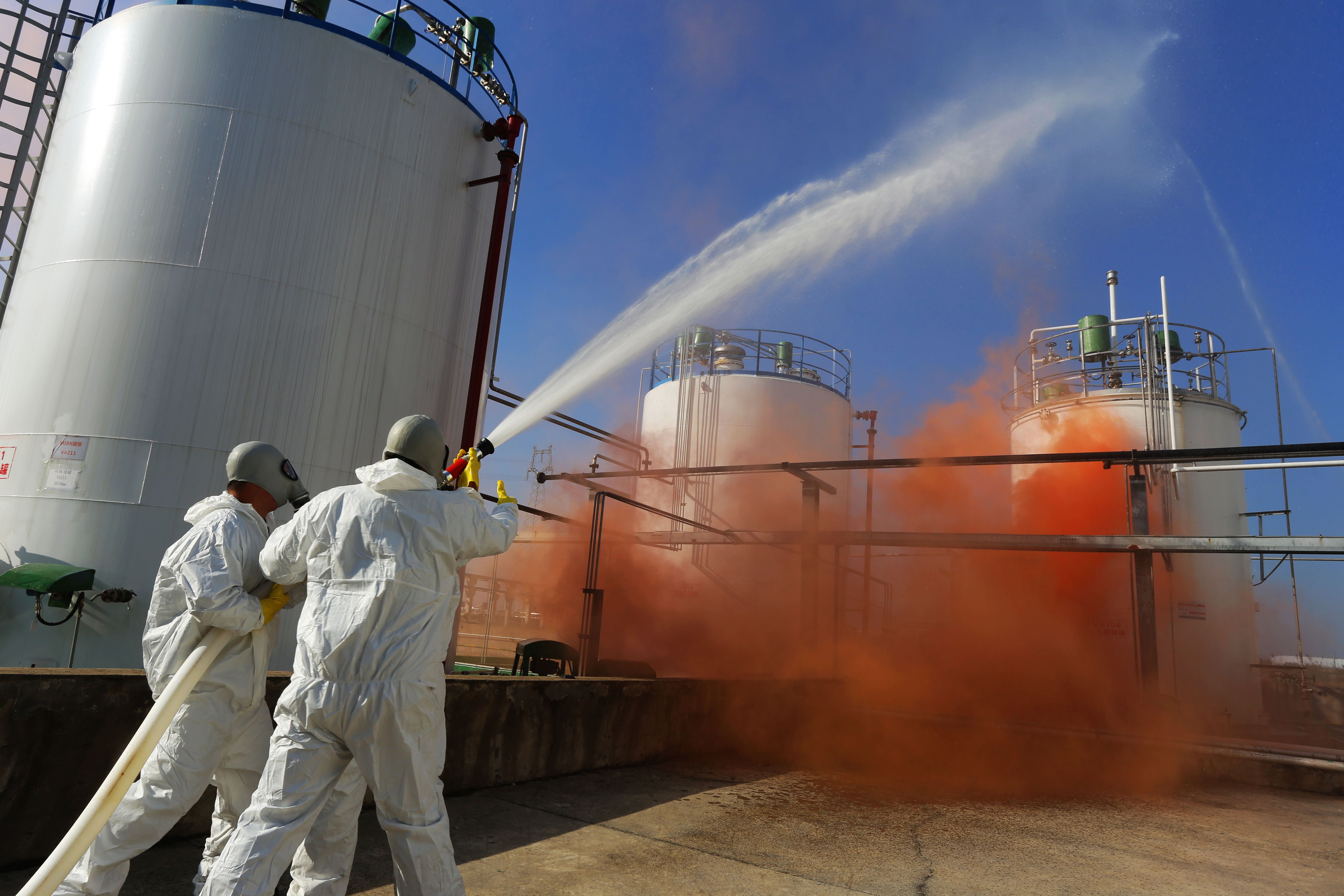 隨著總指揮一聲令下,演練開始。此次演練是模擬甲乙類罐區(qū)三乙胺儲罐閥門法蘭墊子壞損,三乙胺大量泄漏事件。調(diào)度員報警后,立即啟動公司級應(yīng)急預(yù)案,消防分隊、搶險搶修分隊、警戒疏散分隊、污染控制環(huán)境監(jiān)測等7個應(yīng)急救援分隊奔赴現(xiàn)場。搶險搶修分隊穿戴防化服進行實地勘查,堵住事故現(xiàn)場的泄漏點,進行快速洗消處置。經(jīng)過40分鐘緊急處置,三乙胺泄漏得到有效控制,此次環(huán)境突發(fā)事件處置演練順利完成。