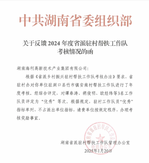 近日,從省派駐村幫扶工作隊(duì)管理辦公室獲悉,集團(tuán)駐洞口縣安南村幫扶工作隊(duì)2024年度以全優(yōu)佳績?yōu)猷l(xiāng)村振興工作交上滿意答卷:工作隊(duì)考核“好”等次,譚春濤、胡俊明、歐經(jīng)緯3名工作隊(duì)員考核“優(yōu)秀”等次。