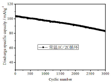 (2)產(chǎn)品電化學(xué)性能優(yōu)異。常溫1C克容量大于100mAh/g,循環(huán)3000周,容量保持率大于80%。