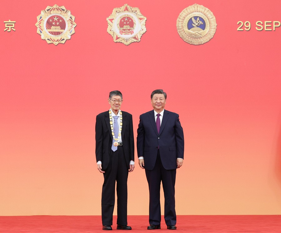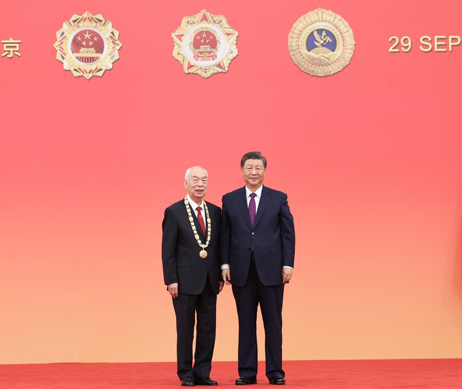 9月29日,中華人民共和國(guó)國(guó)家勛章和國(guó)家榮譽(yù)稱(chēng)號(hào)頒授儀式在北京人民大會(huì)堂金色大廳隆重舉行。中共中央總書(shū)記、國(guó)家主席、中央軍委主席習(xí)近平向“人民科學(xué)家”國(guó)家榮譽(yù)稱(chēng)號(hào)獲得者趙忠賢頒授獎(jiǎng)?wù)?。新華社記者鞠鵬攝